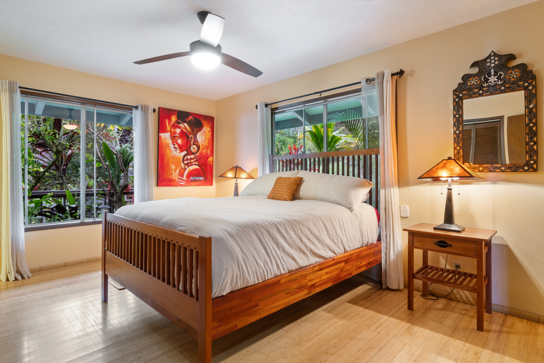 Perched on the hill overlooking the gardens, the Main house has sweeping views of the ocean from the large wraparound lanai. Lush natural tones fill the space with large windows for expansive views. The kitchen is fully stocked, and the main bathroom has a full-size tub. It is the perfect space for families, couples traveling with others or on their own, and for small retreats or family gatherings.