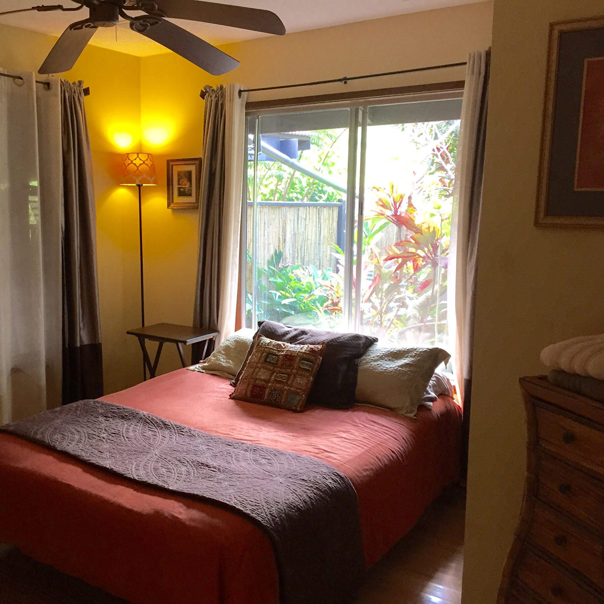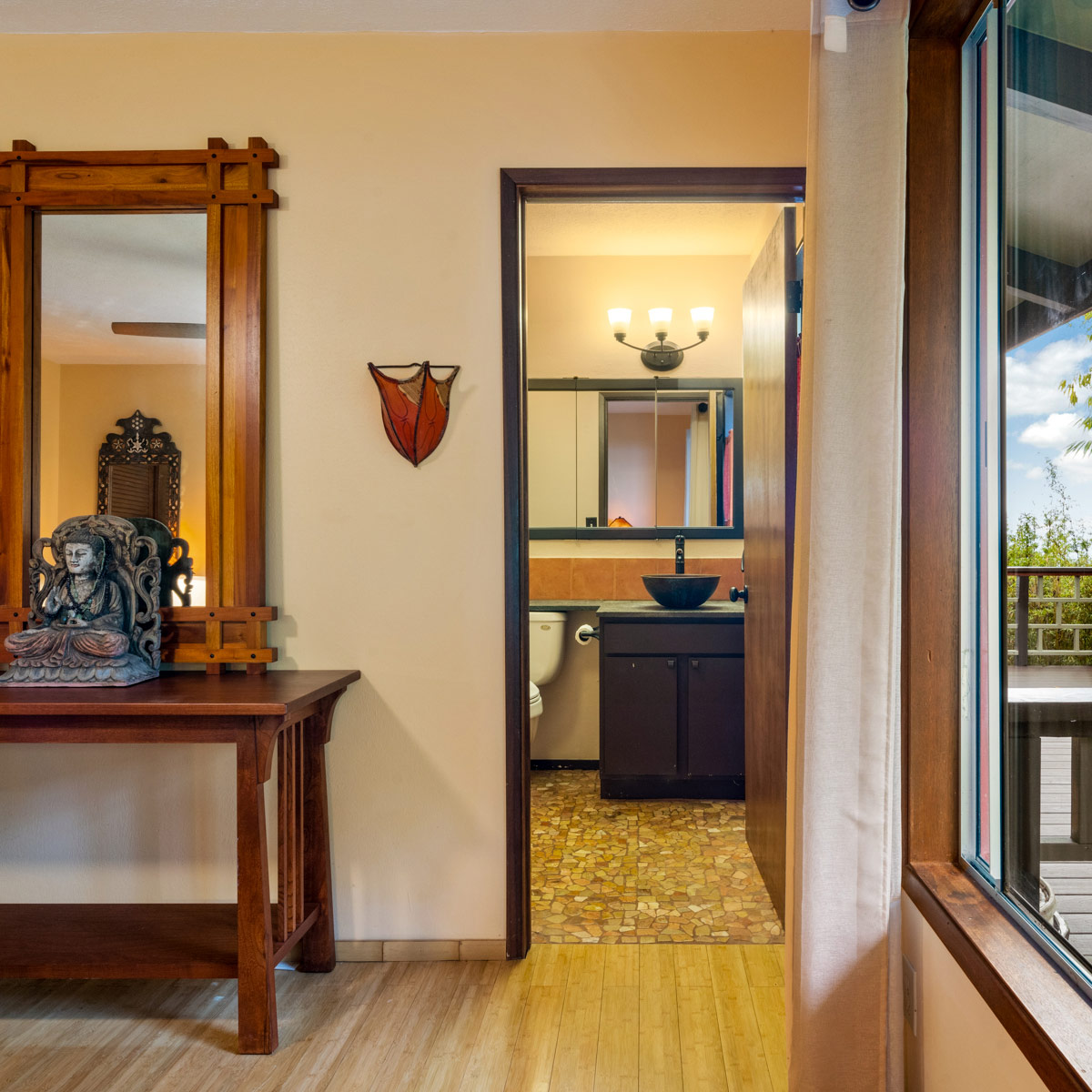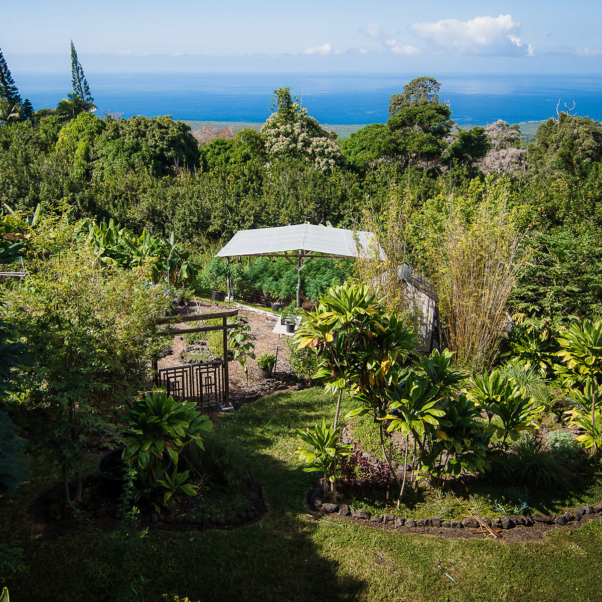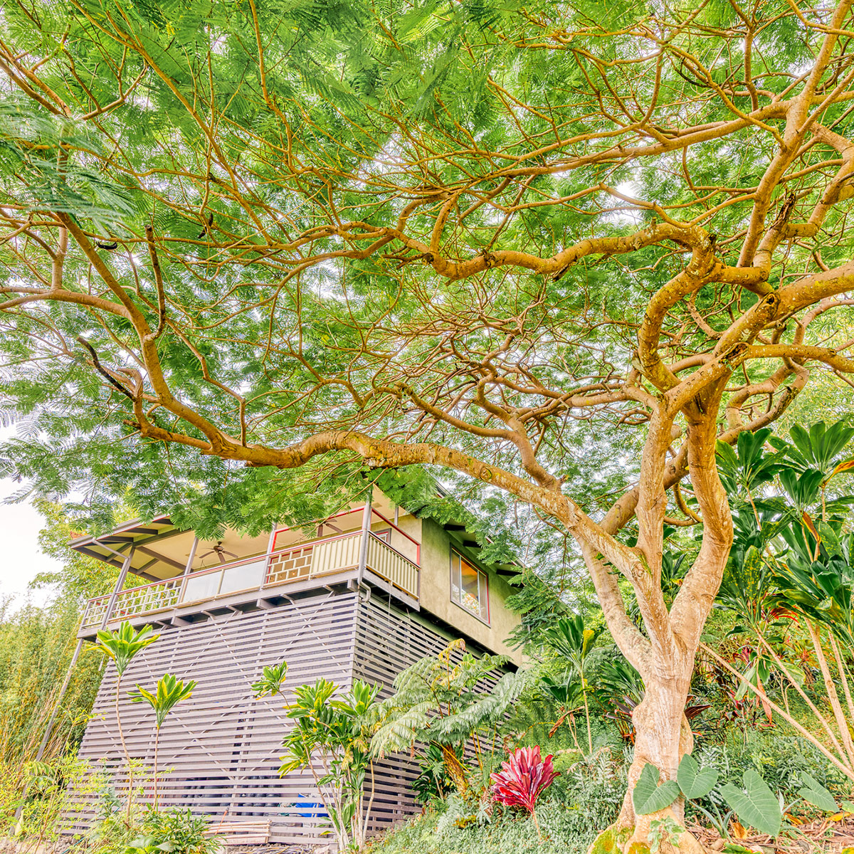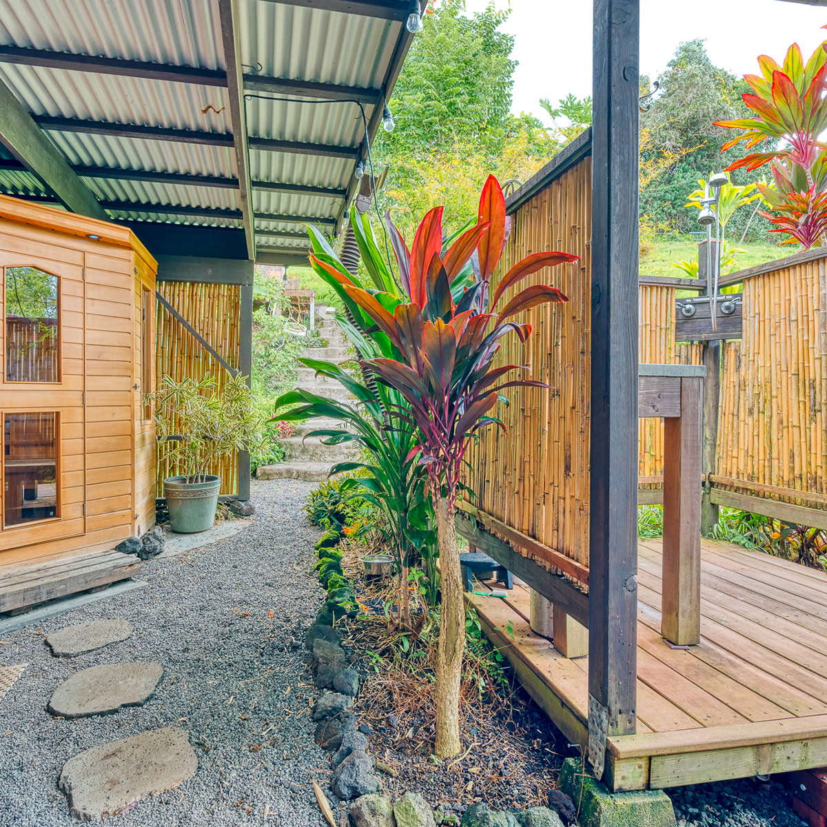 Perched on the hill overlooking the gardens, the Main house has sweeping views of the ocean from the large wraparound lanai. Lush natural tones fill the space with large windows for expansive views. The kitchen is fully stocked, and the main bathroom has a full-size tub. It is the perfect space for families, couples traveling with others or on their own, and for small retreats or family gatherings.