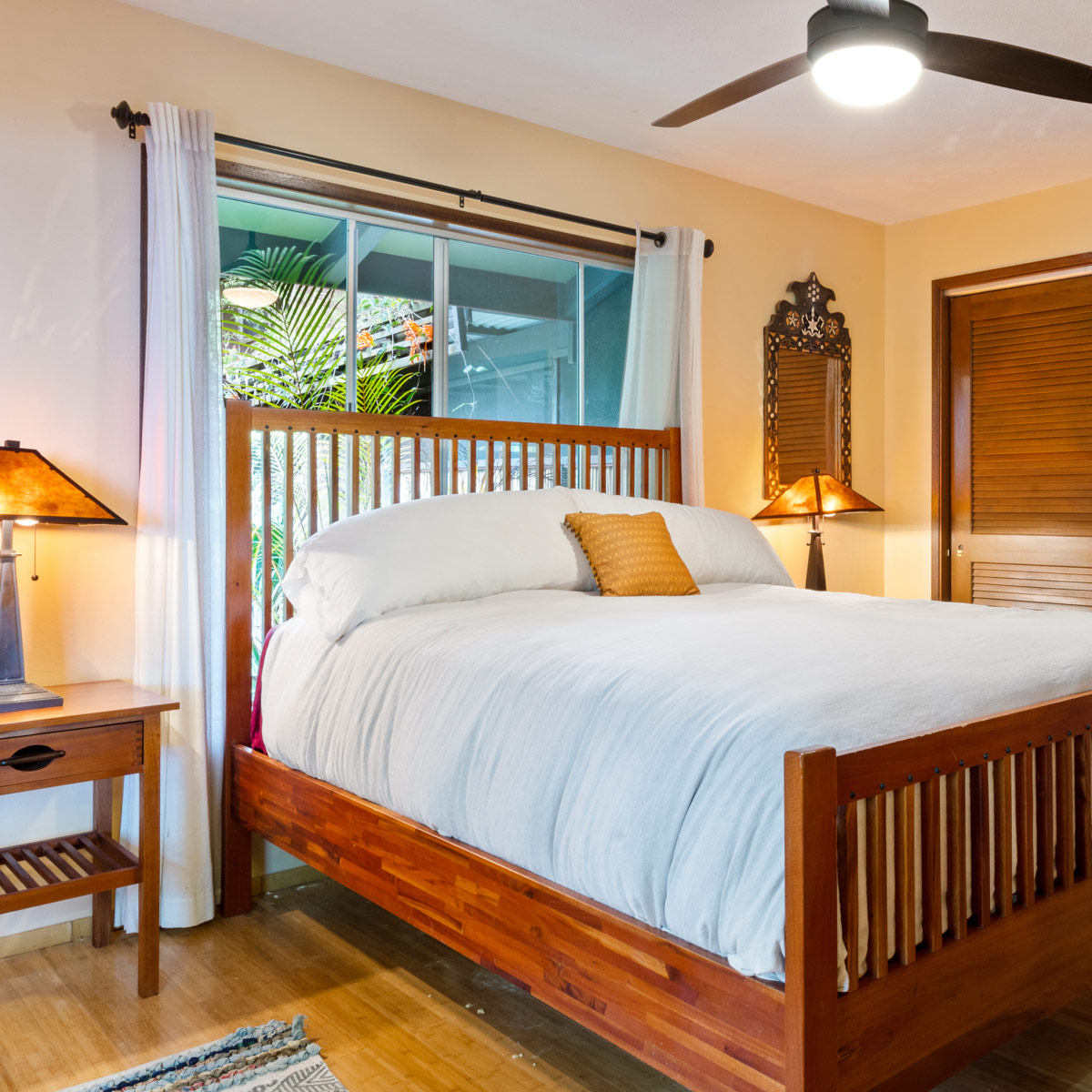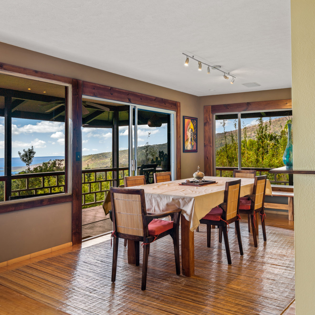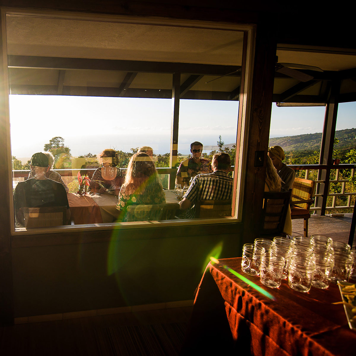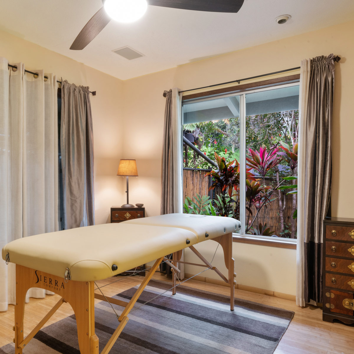 Perched on the hill overlooking the gardens, the Main house has sweeping views of the ocean from the large wraparound lanai. Lush natural tones fill the space with large windows for expansive views. The kitchen is fully stocked, and the main bathroom has a full-size tub. It is the perfect space for families, couples traveling with others or on their own, and for small retreats or family gatherings.