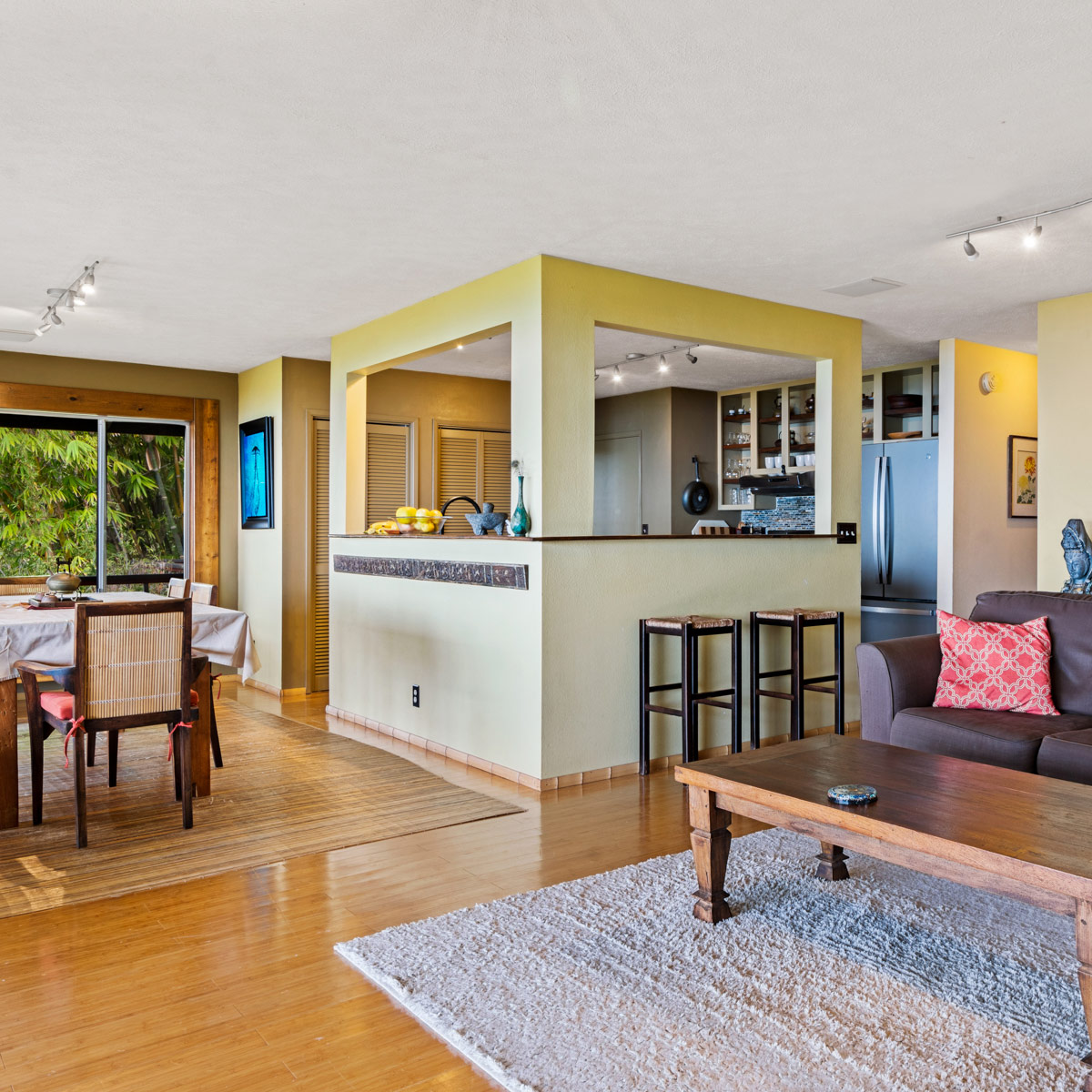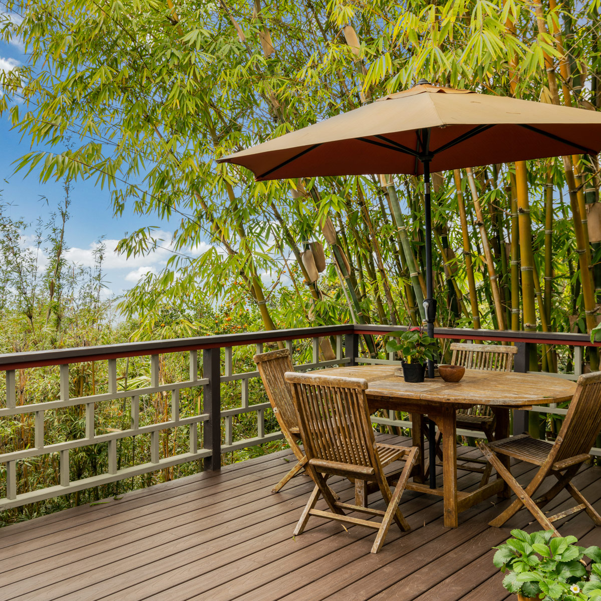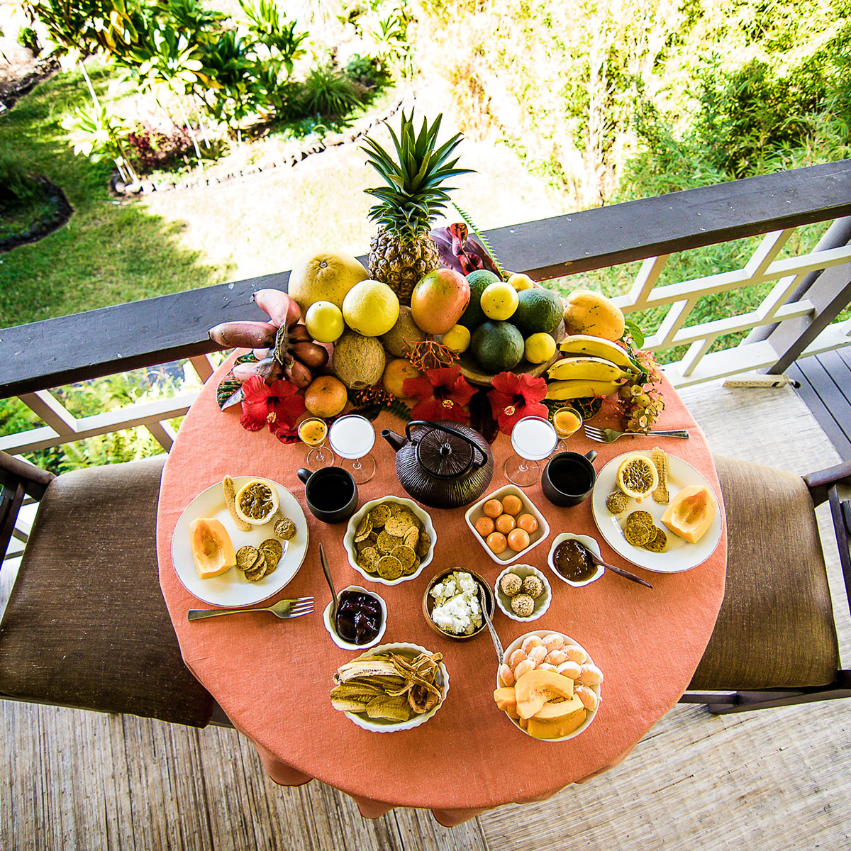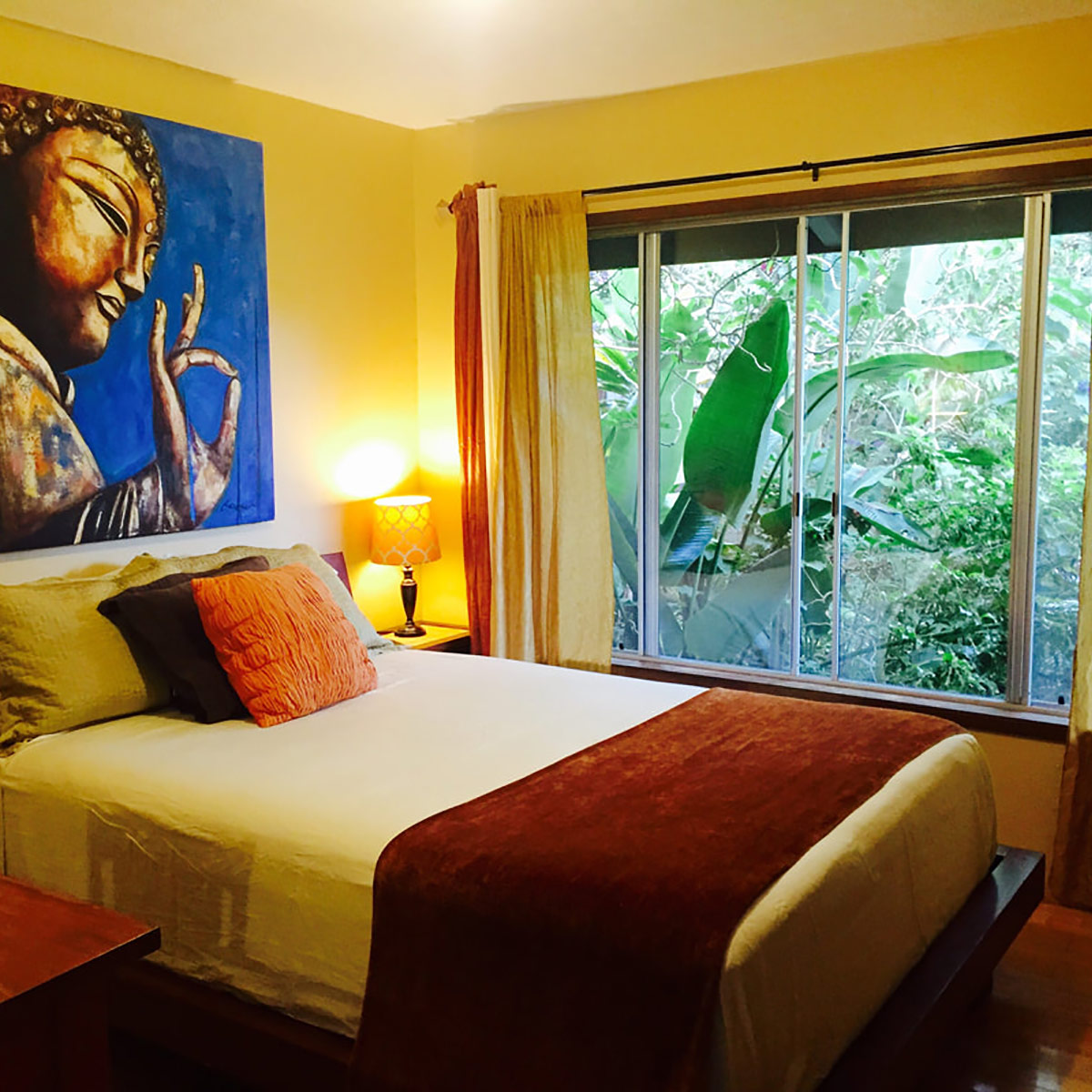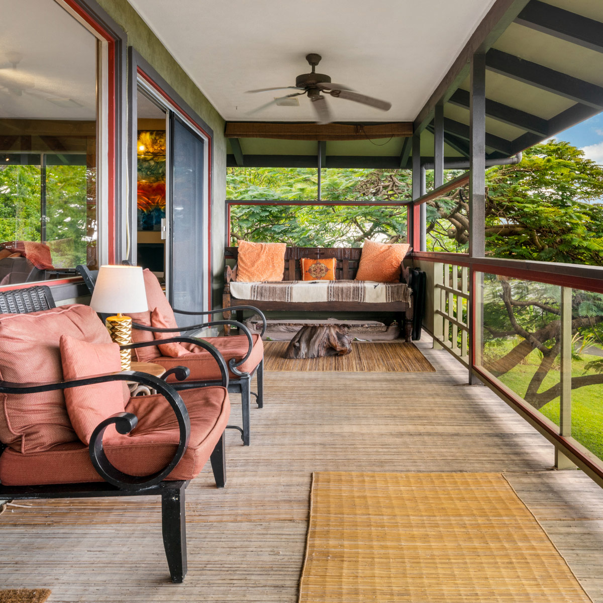 Perched on the hill overlooking the gardens, the Main house has sweeping views of the ocean from the large wraparound lanai. Lush natural tones fill the space with large windows for expansive views. The kitchen is fully stocked, and the main bathroom has a full-size tub. It is the perfect space for families, couples traveling with others or on their own, and for small retreats or family gatherings.